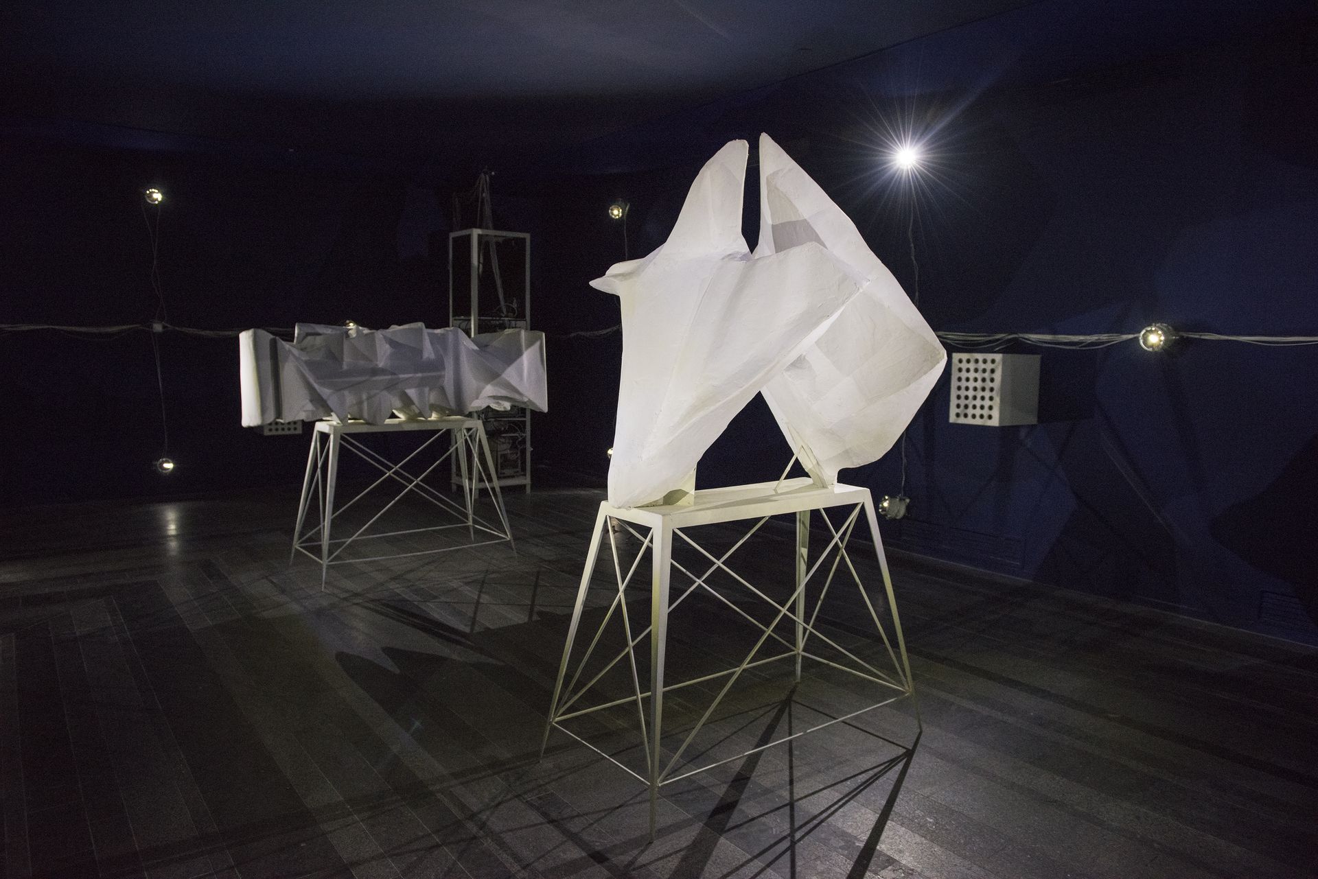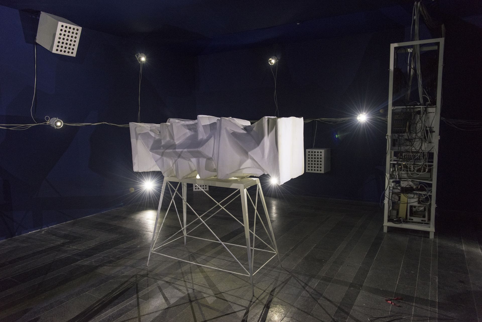 Ivan Svitlychnyi, Adaptation Period, 2015 multimedia environment: audio and visual programming, metal, wood, glass, cardboard, plaster, analog and digital equipment, audio system 6:0, LED lights