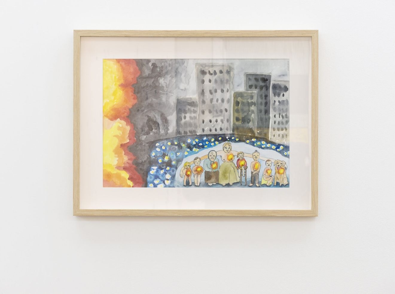 From Ukraine there are works from among others Oleksandr Burlaka (1982), Oksana Chepelyk (1961), Danylo Galkin (1985), Nikita Kadan (1982), Alevtina Kakhidze (1973), Lesia Khomenko (1980), Kinder Album, Vlada Ralko (1969), Oleksii Sai (1975), Andriy Sagaidakovsky (1957), Yevhen Samborsky (1984), Anna Zvyagintseva (1986) and the group of Yarema Malashchuk (1993) and Roman Khimei (1992). Their works are in some cases early pieces, including a 1990s painting by Andriy Sagaidakovsky, depicting in exclusively blacks and greys a Ukrainian landscape with the text “Sometimes man is tired very much and wants to sleep a lot” – a poignant comment on the exhaustion of war. Others have been created during this war, displaying works that directly respond and reflect on current contexts. A symbolic example is that of Lesia Khomenko, who has engaged in painting soldiers and volunteers throughout the war. For the exhibition, she showcases a first group composition of soldiers supported by volunteers who formed a community around the army. It exemplifies Ukraine’s unshakable unity, a common rally around the purpose of survival.