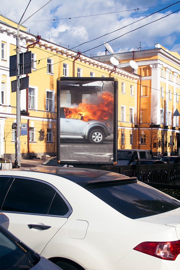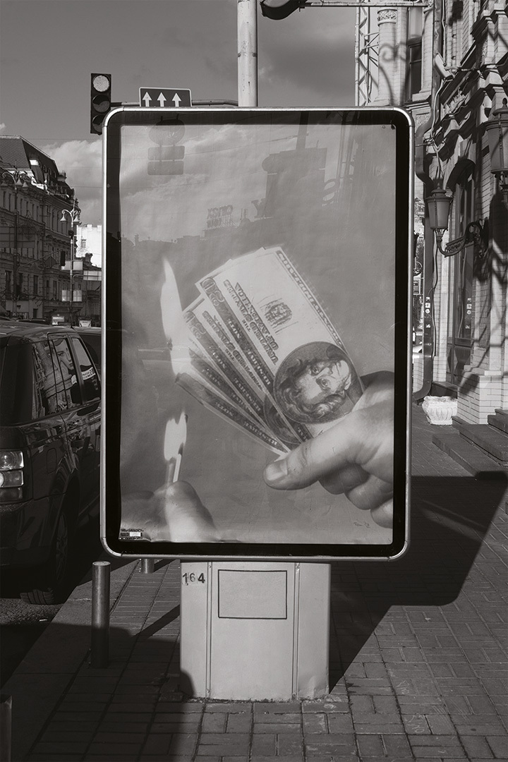 Oleksandr Kurmaz started his artistic practice as a graffiti artist. When he gradually left the medium behind, he kept public space as his main domain and continued to use underground strategies of hijacking public space branded by advertisement and private commercial messages. In most of his work he plays a game of de-powering power structures, using both humoristic and conceptual interventions.
