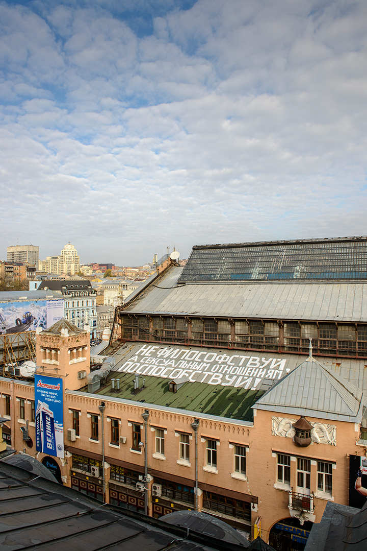 During the exhibition of the 20 shortlisted artists for the PinchukArtCentre Prize 2013, Kurmaz claims both the exhibition venue and the Besarabska market hall and its surroundings. By a series of interventions, Kurmaz confuses the private and public space, cracking open the set expectations of the passer-by.