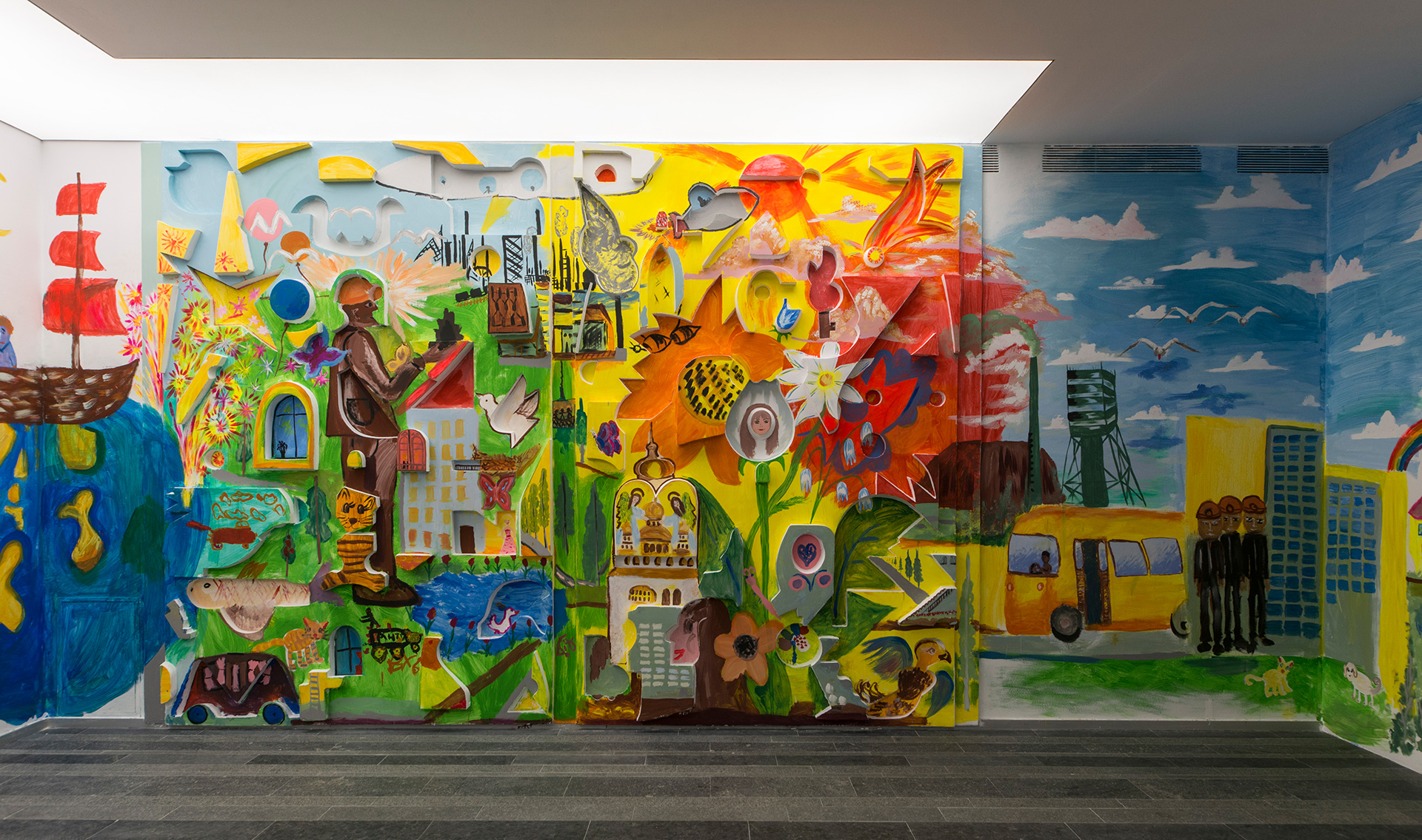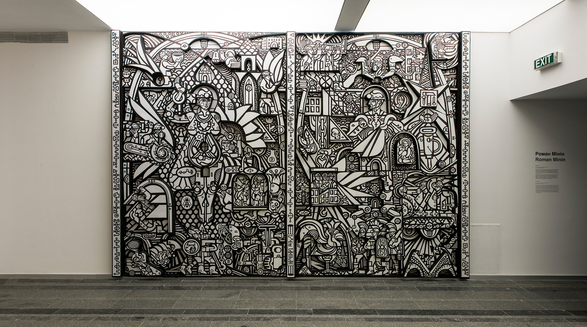The Donetsk region, where Roman Minin was born, is identified by mining. For the people living there it is not only an industry but a way of life. Minin has taken that as the main subject of his paintings and stained-glass windows, a metaphor for a closed social system that allows no way out. With The Plan of Escape from the Donetsk Region, Minin created his own artistic escape route from that imprisonment.