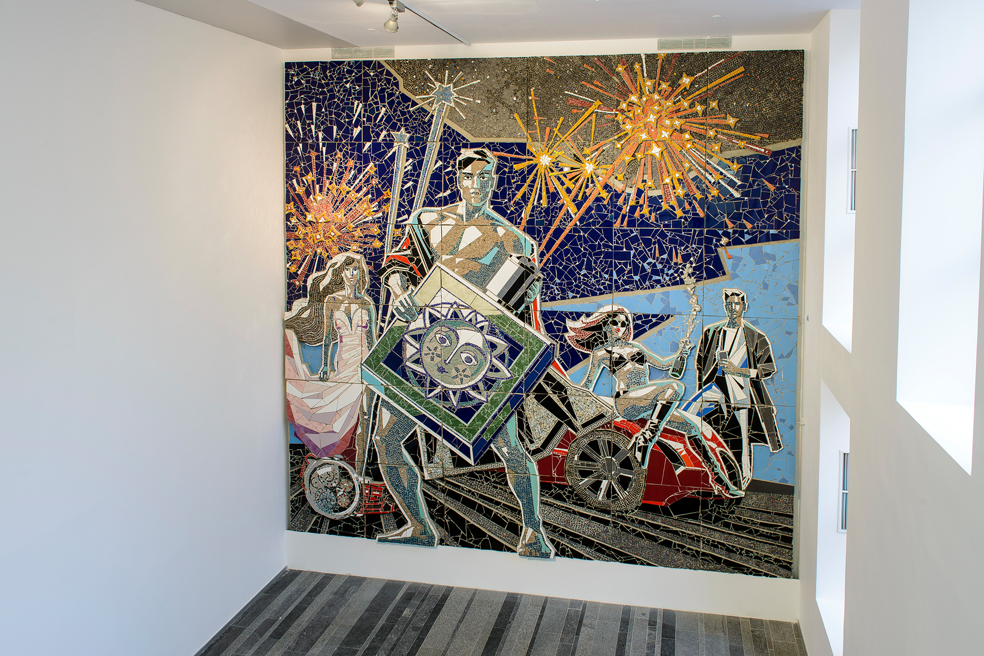 For the exhibition of the 20 shortlisted artists for the PinchukArtCentre Prize 2013 Kadyrova takes a new step in her artistic practice, resuming the lost tradition of mosaics, which can be found in public spaces all over the former Soviet Union. Those mosaics had an educational use, advocating morals and values. Adopting the same material and artistic language, Kadyrova transforms them by bringing them inside the gallery. Her work reflects critically on the changed use of images inside the public space and the decaying heritage of former soviet traditions.
