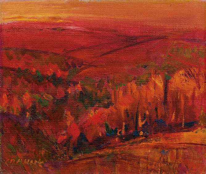 Таково полотно «И невольные слезы катятся…» (1992). Его название, начертанное автором на обороте холста, взято из знаменитого романса Николая Харито «Отцвели уж давно хризантемы в саду», в то время как глаз зрителя притягивает другая, не менее известная строчка Максимилиана Волошина, вынесенная в центр композиции.
