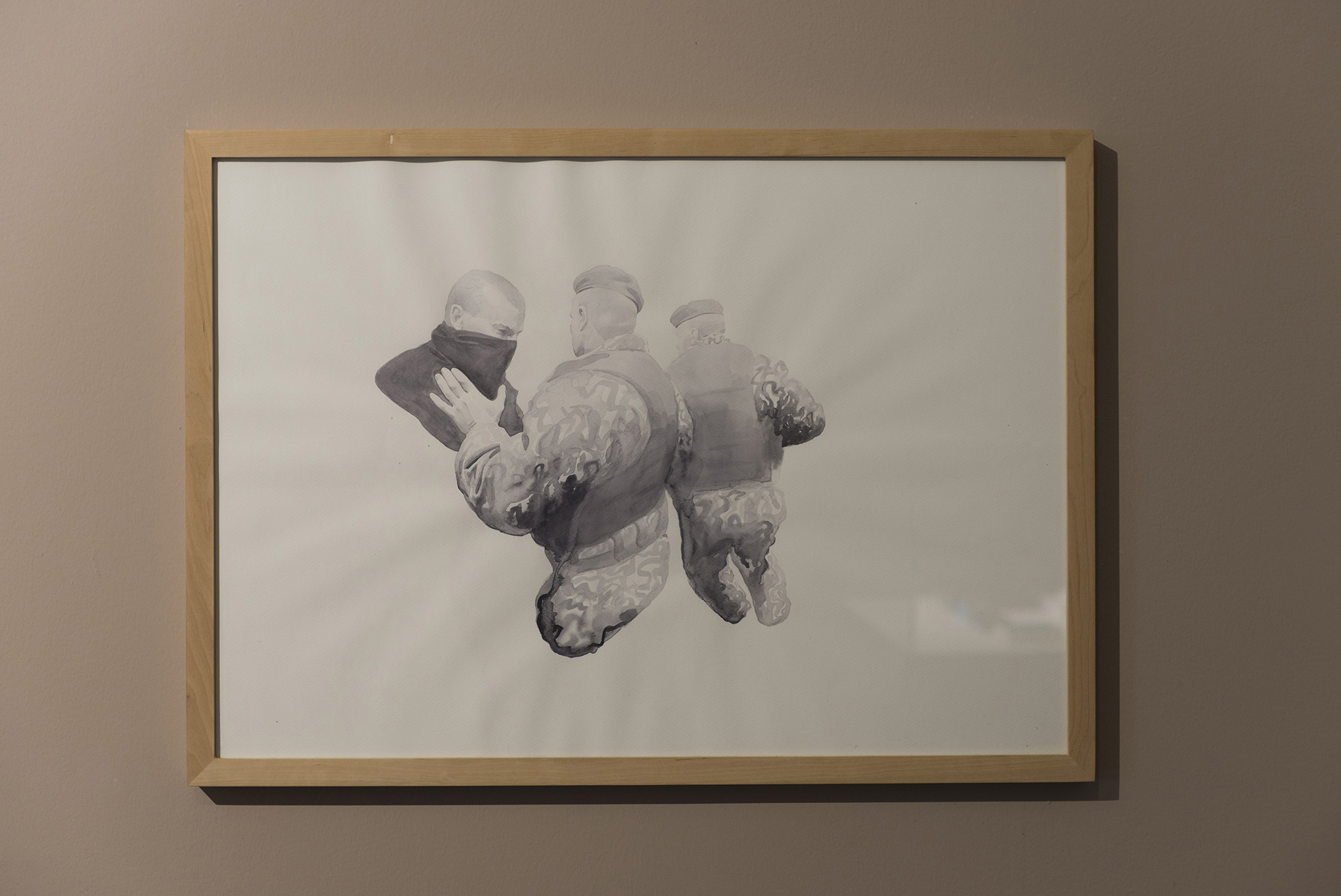 Виставка починається на другому поверсі, де представлені три роботи Жанни Кадирової, які досліджують тему конфлікту.