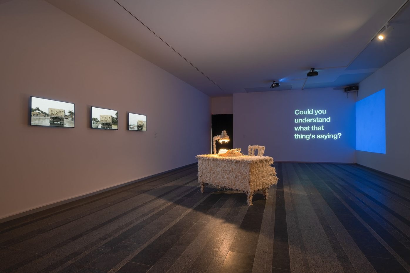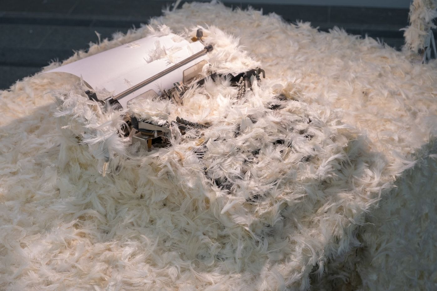 стіл, стілець, лампа, друкарська машинка, пір’я (виставкова копія) Надано художницею. Створено за підтримки PinchukArtCentre
