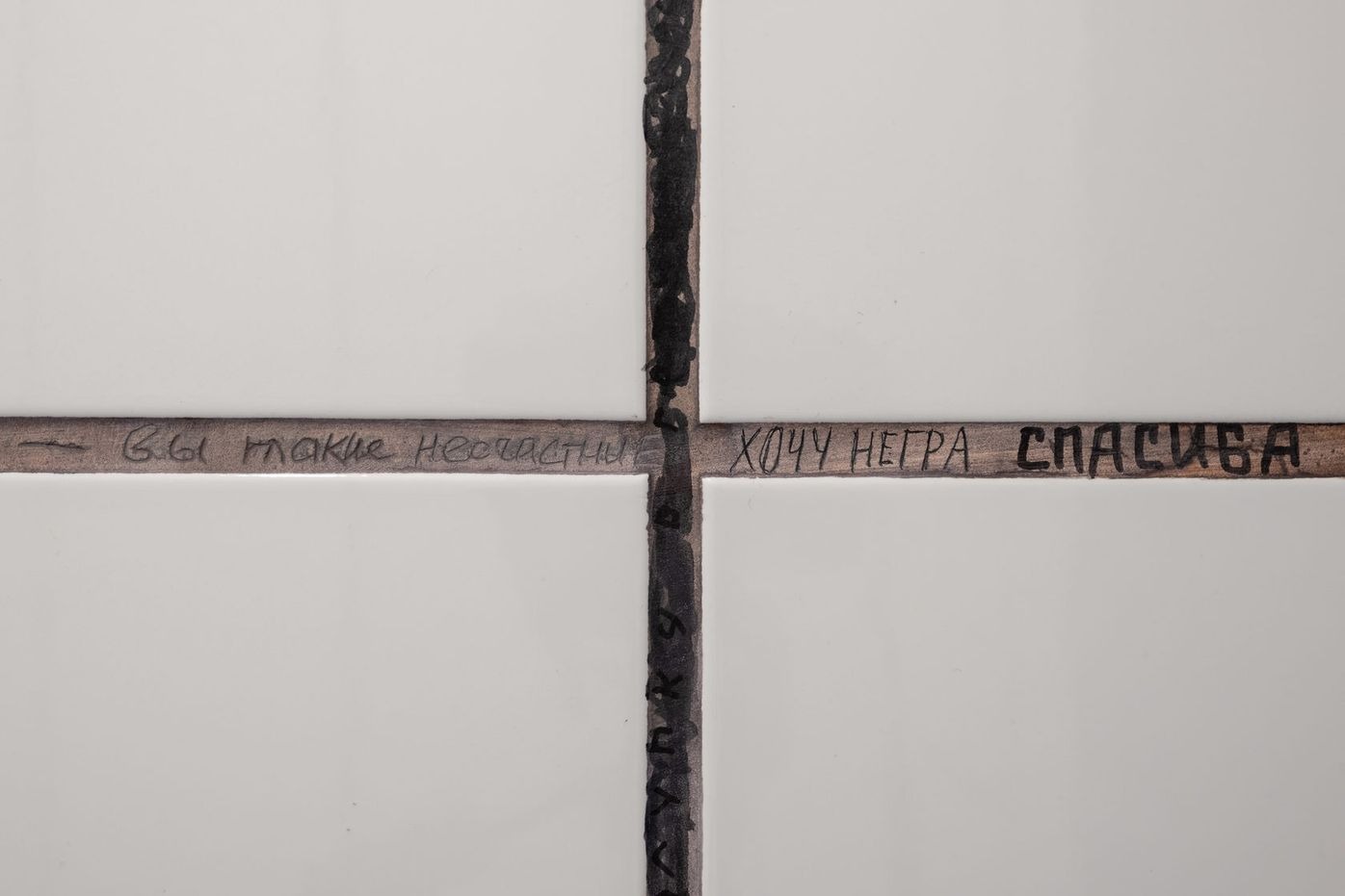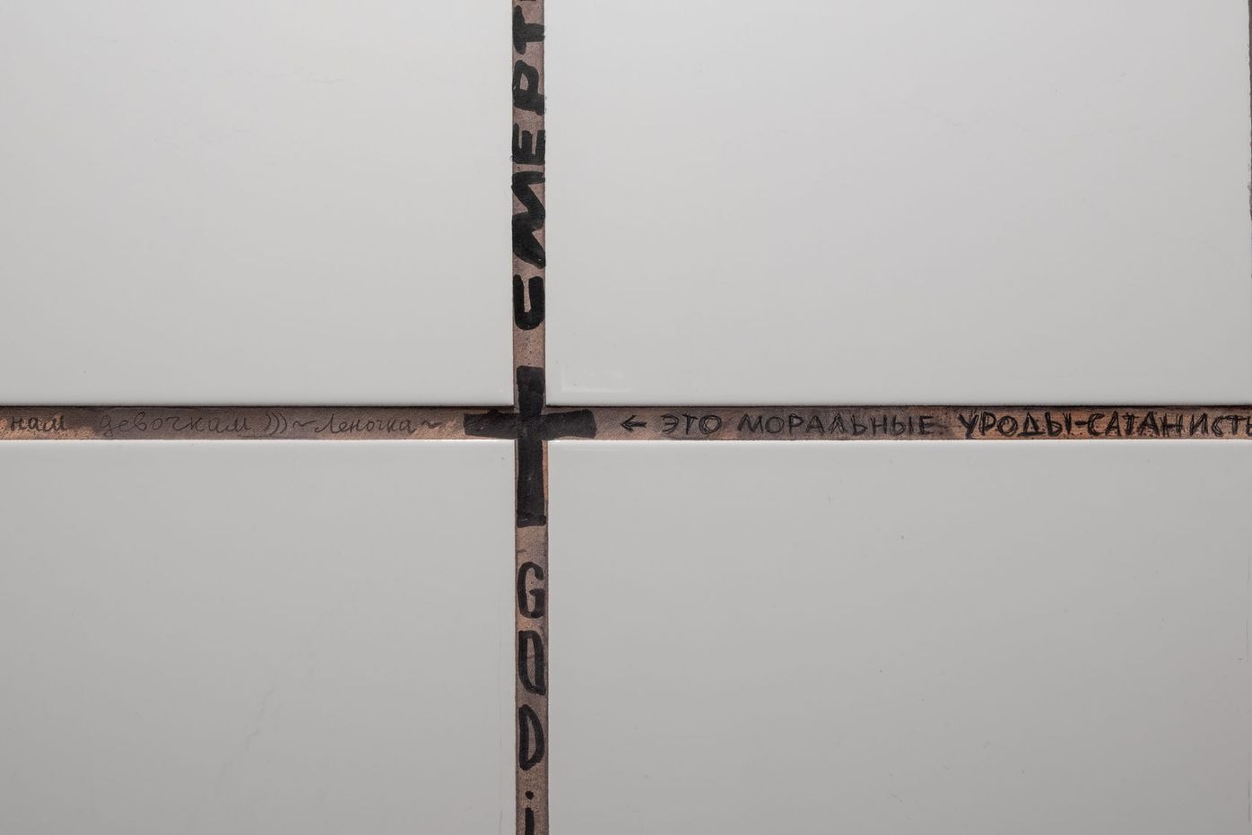 У роботі ми стикаємося з реаліями голосу меншості в громадському просторі. Робота побудована на документуванні записів на швах між плитками кахлю в громадських туалетах Мінська, які є єдиним місцем комунікації для гей-спільноти. Комунальні служби старанно стирають такі записи, але простір між плиткою не піддається швидкому очищенню. Робота є відбитком реального громадського простору: стерилізованого, агресивного по відношенню до будь-яких нетипових форм поведінки, де все, що не вписується в норми патріархального і консервативного владного курсу, витісняється в приховані зони: клуби, квартири, туалети. Ці шви, на думку влади, покриті брудом, але для Сергія Шабохіна це символ свободи висловлювань.
