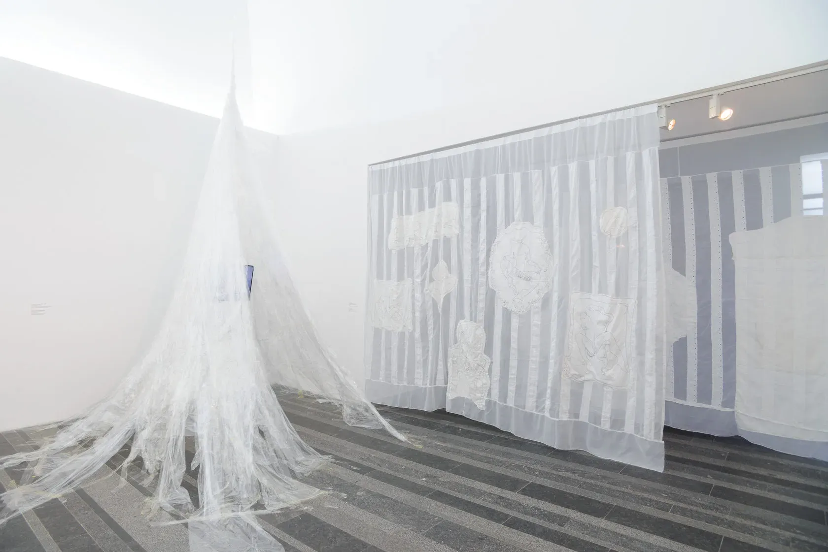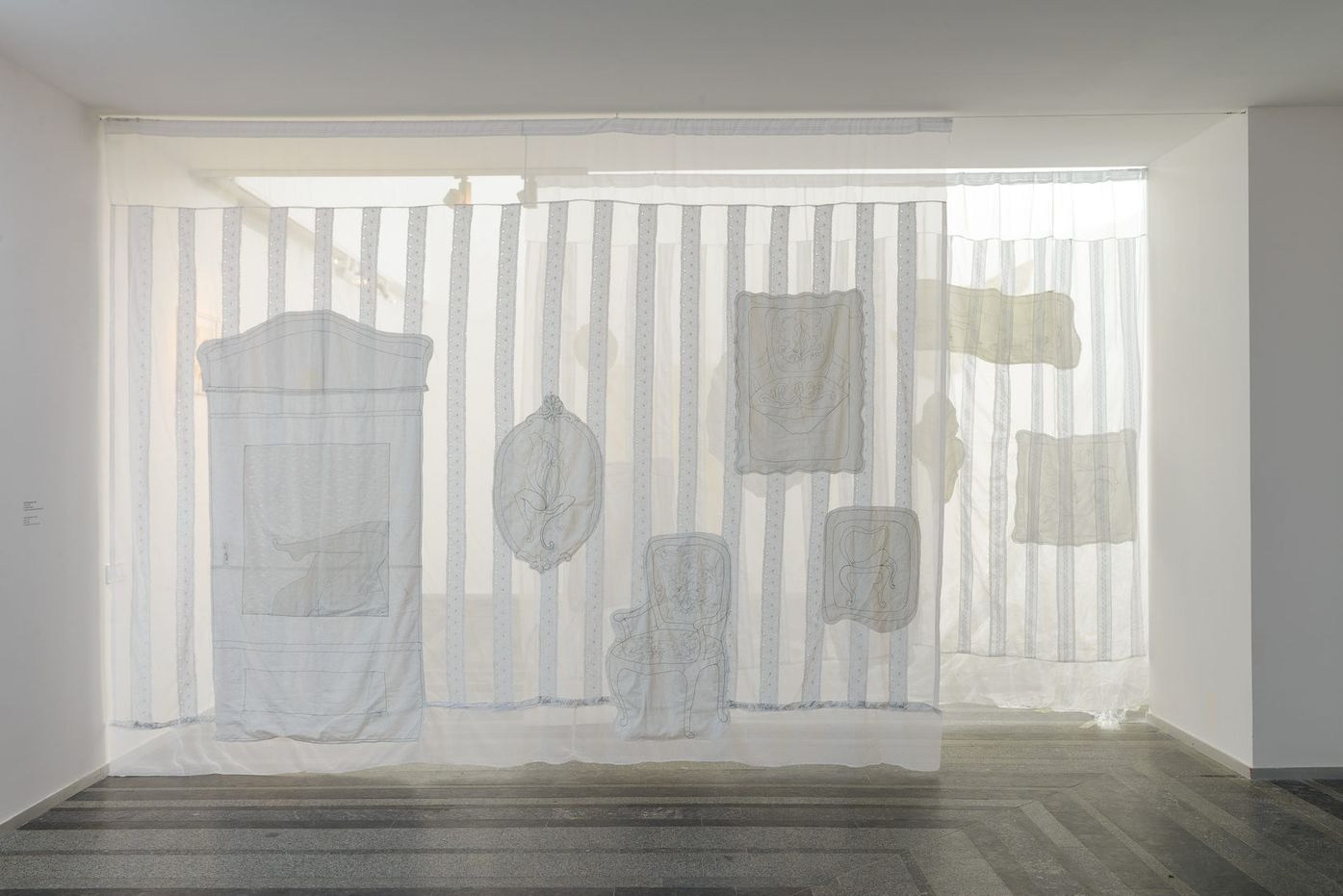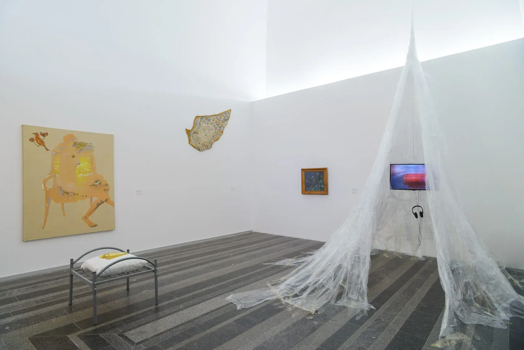 Аліна Копиця у своїй художній практиці усвідомлено використовує текстиль як «типовий» жіночий матеріал, але насичує його відвертими еротичними змістами, проблематизуючи позицію жінки в сучасному суспільстві. Її нова робота фізично розділяє дві кімнати і позначає розділ виставки, присвячений інтимності. Робота постає як метафора потаємного особистого світу і водночас як перешкода на шляху глядача, приховуючи й захищаючи. Зібрані в одному просторі всі ці твори втілюють «перехрестя» різних «кімнат»: її відсутності (Білокур, Примаченко), непевності і самокатування (Жаркова, Клейтман), комфорту (Скугарєва).