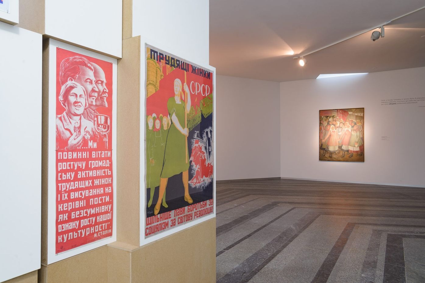 Концептуальне вирішення зали позначилося на трансформації її архітектури, яка задає дві смислові лінії. Першу пов’язано зі святом 8 Березня як утіленням ідеї боротьби за рівність, а друга показує, що ця рівність певною мірою досягалася коштом маскулінізації жінки. Першу лінію розпочинає робота Оксани Павленко «Хай живе 8 березня!», у якій художниця зобразила групу жінок, котрі вийшли на демонстрацію. Нині робота нагадує про політичний заряд цього свята, яке з другої половини ХХ століття перетворилося на декоративне привітання чоловіками жінок. Цю першу лінію посилюють плакати 1920–1940-х років із гаслами й закликами. Більшість плакатів нагадують про першу хвилю фемінізму, яка в Радянському Союзі тривала зовсім недовго і завершилася вже на початку 1930-х. Авангардні за формою, сміливі за змістом плакати 1920-х років демонструють справжню спробу емансипації жінки, тоді як плакати середини 1930–1940-х років тільки експлуатують і імітують колишні заклики до рівності. Це виразилося і в художній формі: плакати стають сірими, шаблонними, безóбразними. Поєднані в одній інсталяції вони перетворюються на символічну «руїну історії», оприявнюють людську властивість забувати.