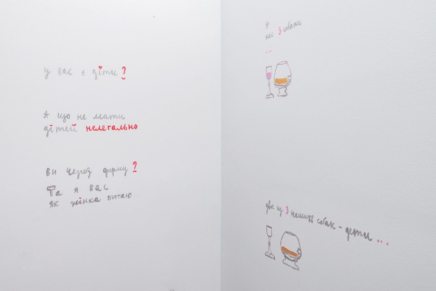 Інсталяція Євгенії Бєлорусець «Я і вона» — авторське переосмислення роботи, яку художниця створила в рамках проекту «Жіночий цех», організованого незалежною групою «Феміністична офензива», що відбувся 2012 року в Центрі візуальної культури. Тоді Бєлорусець запропонувала учасникам вибрати будь-який предмет, який відповідав би їхній особистій фемінній ідентичності, і замислитись над своїм вибором — яке він має значення. Результатом роботи стала «колекція» фотографій із зображенням учасниць і учасників та їхні «голоси» у формі супровідних текстів. Проект зафіксував ситуацію існування спільноти, яка давала підтримку і можливість вільно проговорювати табуйовані суспільством теми.