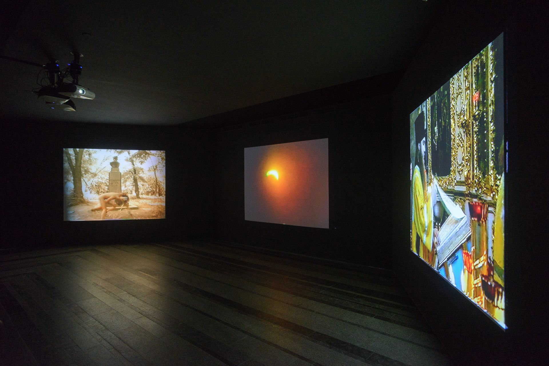 Триканальне відео Олександра Ройтбурда “Балканська ритуальна музика” створює містичну і дещо моторошну атмосферу – те саме відчуття, які викликають забобони і релігійні обряди. Тут знову розкриваються первісні інстинкти людини, від яких неможливо позбутися. Залишається лише сублімувати. Образ людини з головою мавпи влучно характеризує сучасне суспільство, думки якого спрямовані на задоволення тваринних потреб, не зважаючи на всі інтелектуальні і технологічні досягнення людства.
