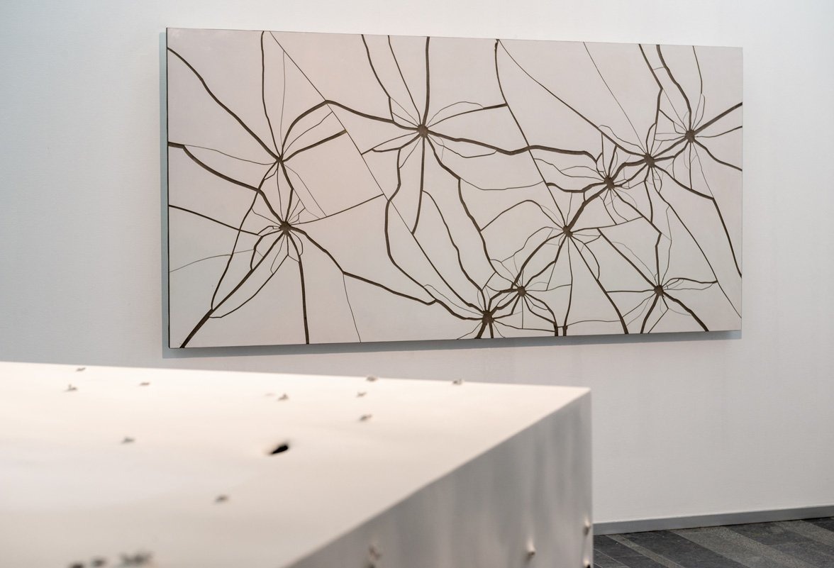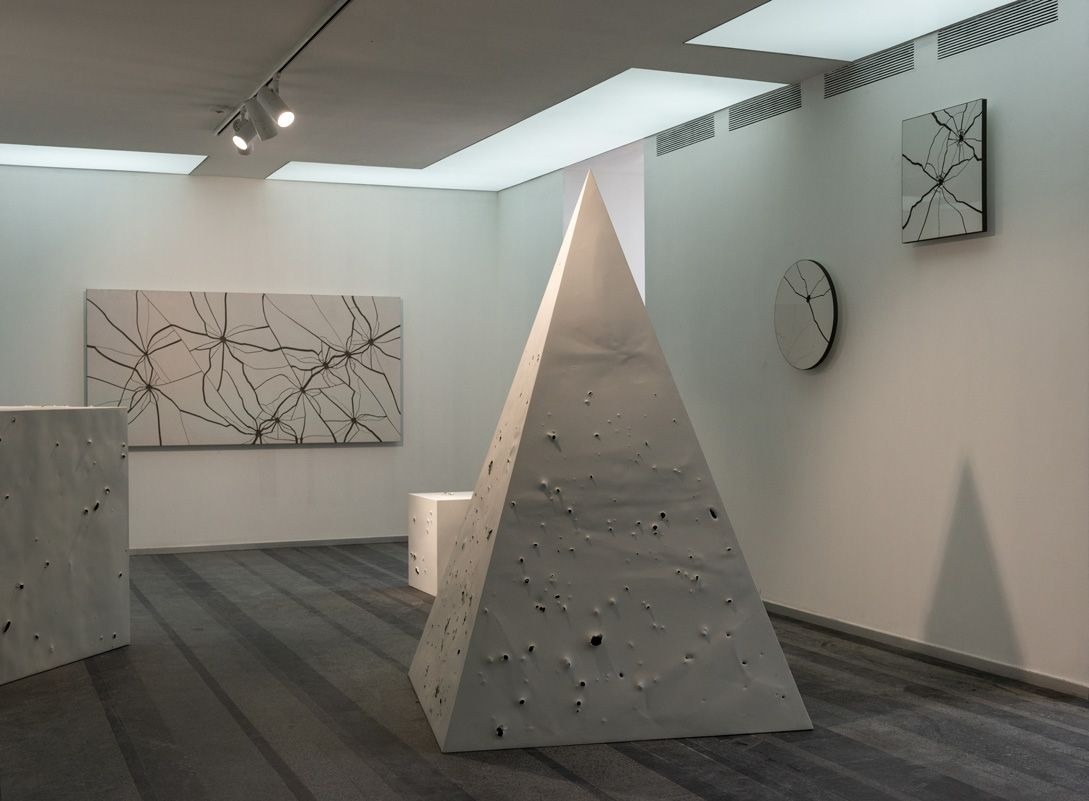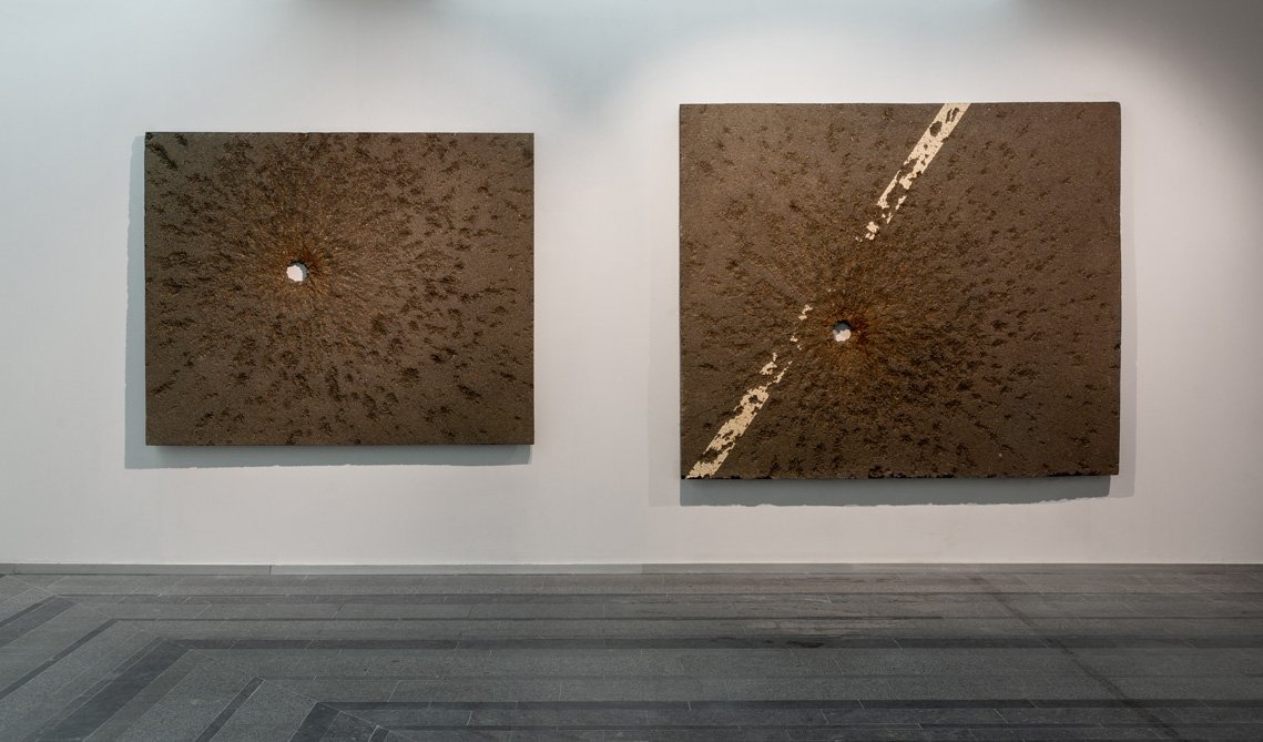У цій кімнаті ми бачимо прямокутні шматки асфальту зі слідами вибухів, вирізані з дорожнього полотна. Вони виставляються як великоформатні абстрактні картини, а разом складають створену цього року роботу Data Extraction (Вилучення даних).