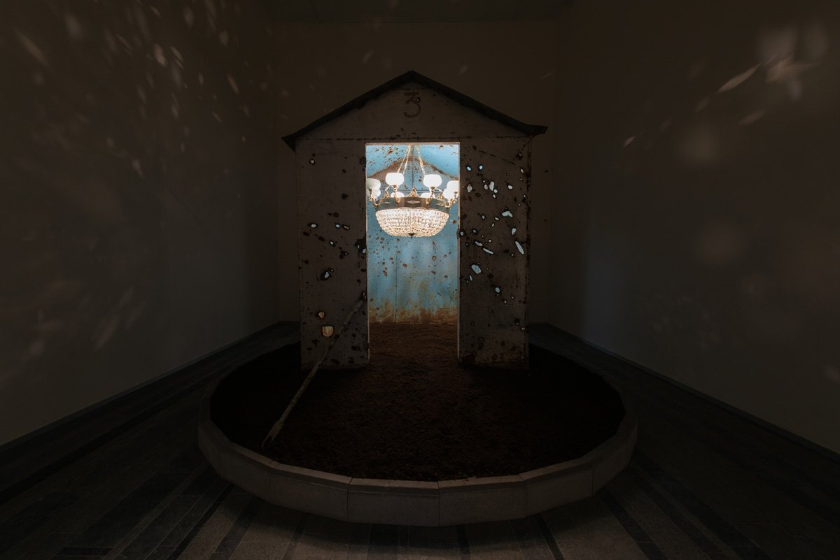 Пізніше з цього досвіду народилась ідея нового пам’ятника, створеного зі знайденої в Херсонській області конструкції, зрешеченої кулями під час бойових дій. Всередину цього об’єкта авторка поставила вишукану люстру із палацу культури в Бериславі, південноукраїнському місті, що було окуповане російськими військами майже до кінця 2022 року. Ця робота – нагадування про те, що просто зараз Росія цілеспрямовано знищує український культурний спадок.