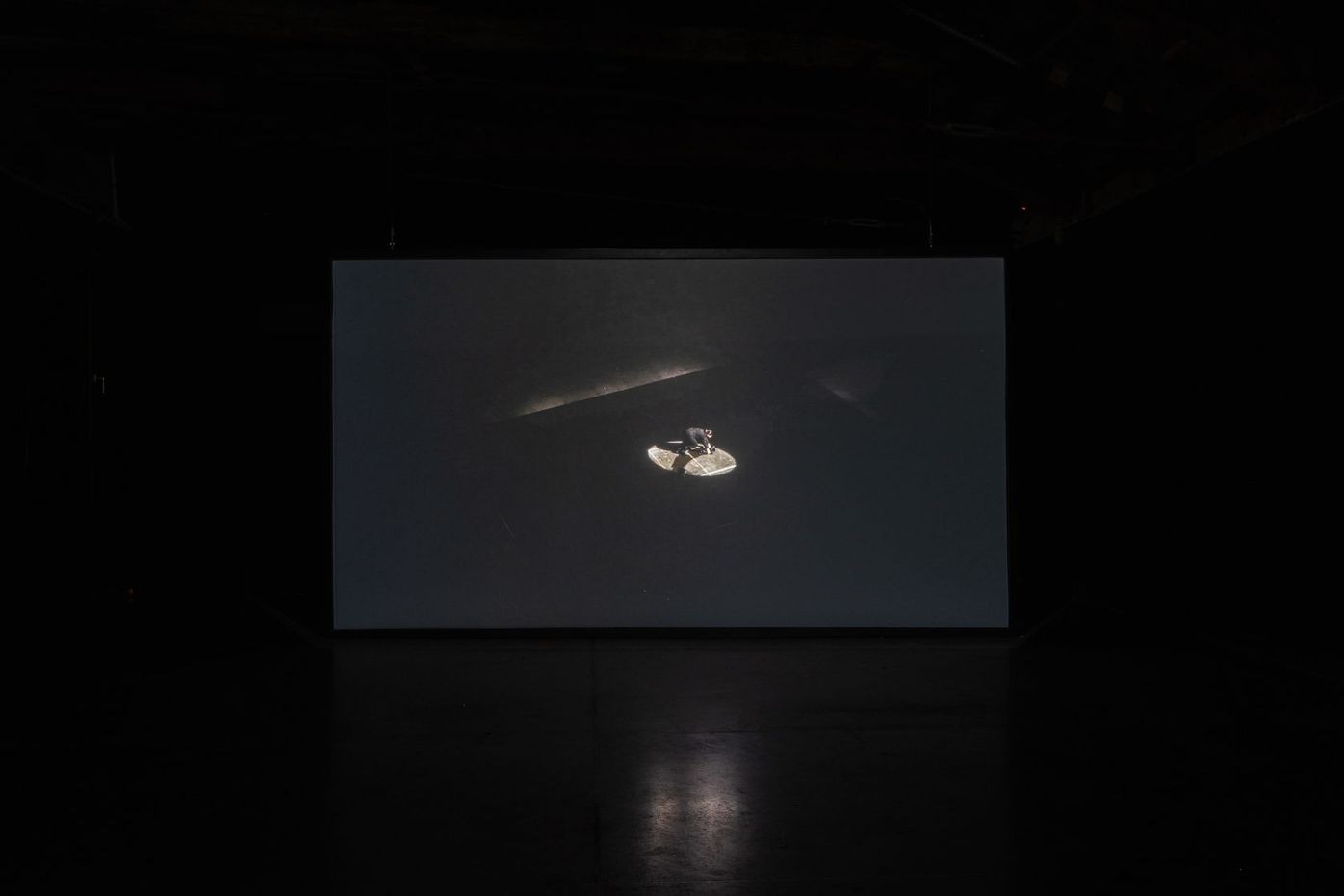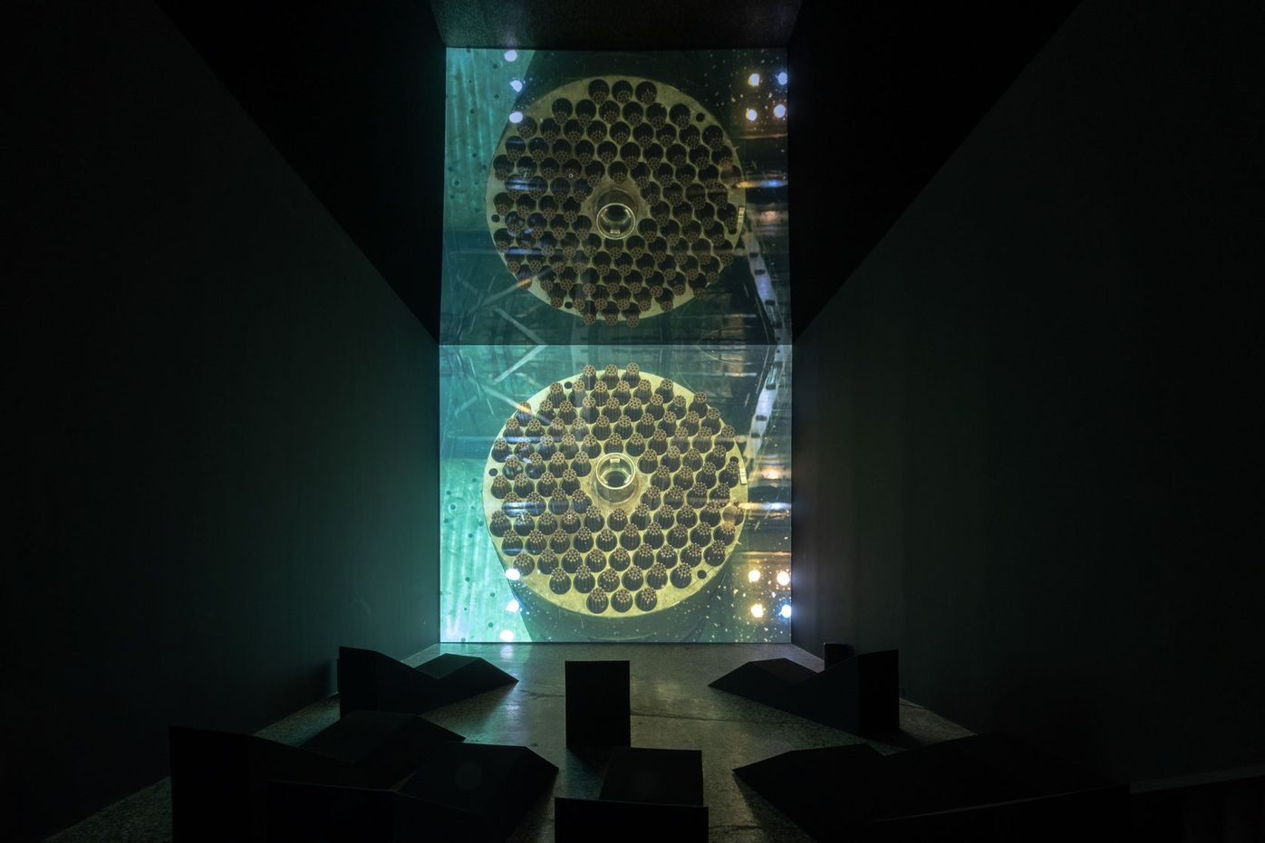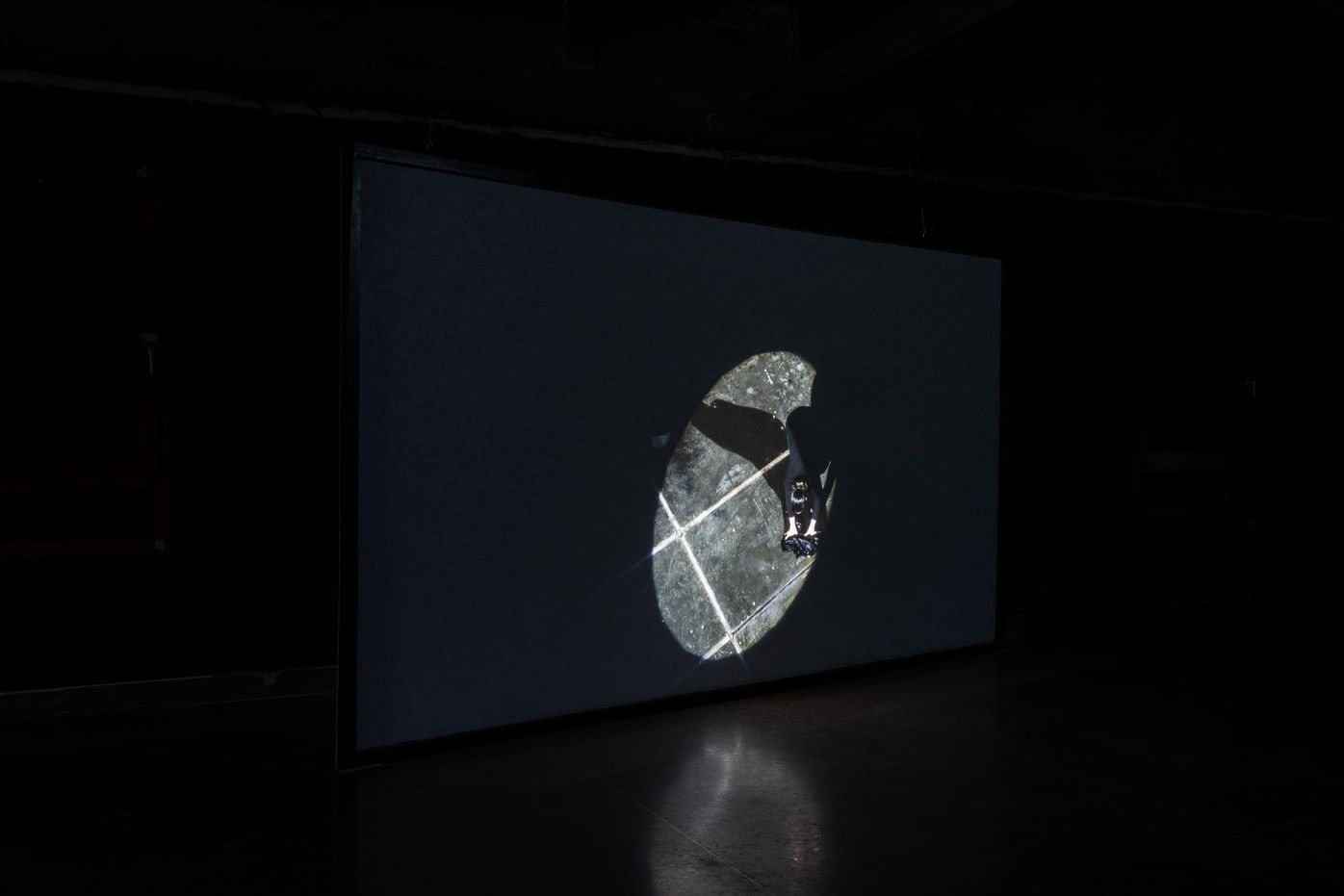 Емілія Шкарнуліте досліджує мінливу межу між документальним і художнім, між екологічними та космічними силами, розглядаючи будь-які нелюдські і постлюдські масштаби в глибині простору і часу. Робота «t1⁄2» продовжує тему постлюдської міфології у художній візуальній медитації про сучасну науку з точки зору майбутньої археології. Назва відсилає до символу, що позначає «період напіврозпаду» – термін, що широко використовується в ядерній фізиці для описання радіоактивного розпаду. У роботі, представленій у вигляді масштабної відеоінсталяції, постає архітектура, сконструйована художницею за допомогою 3D-сканерів дистанційного зондування і дзеркальної стелі, що запрошує у мандрівку епічним географічним ландшафтом.