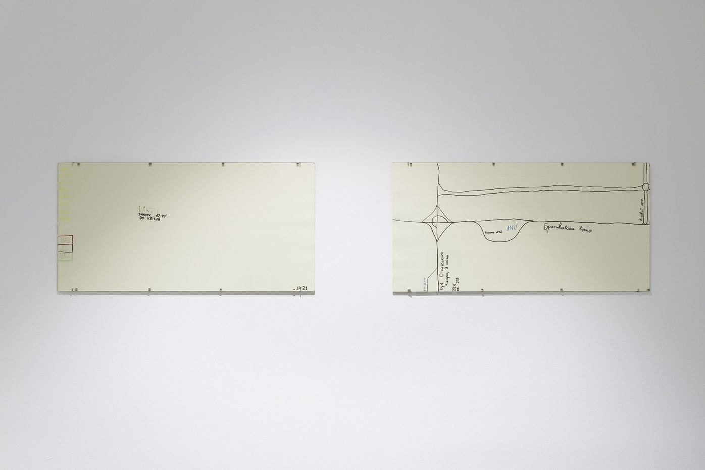 Ліворуч: Варвара Шишлова. На морі, 2020, відео. Праворуч: Георгій Алавердов. На чорному морі, 2020, настінний розпис акрилом