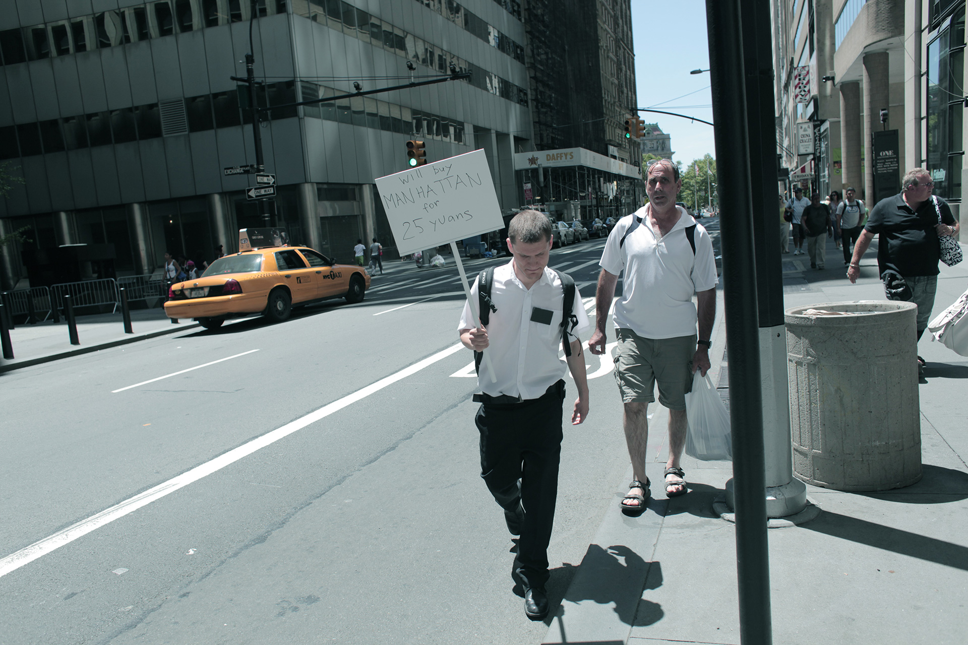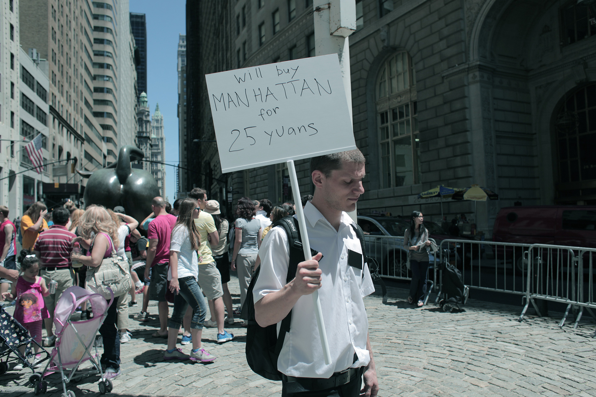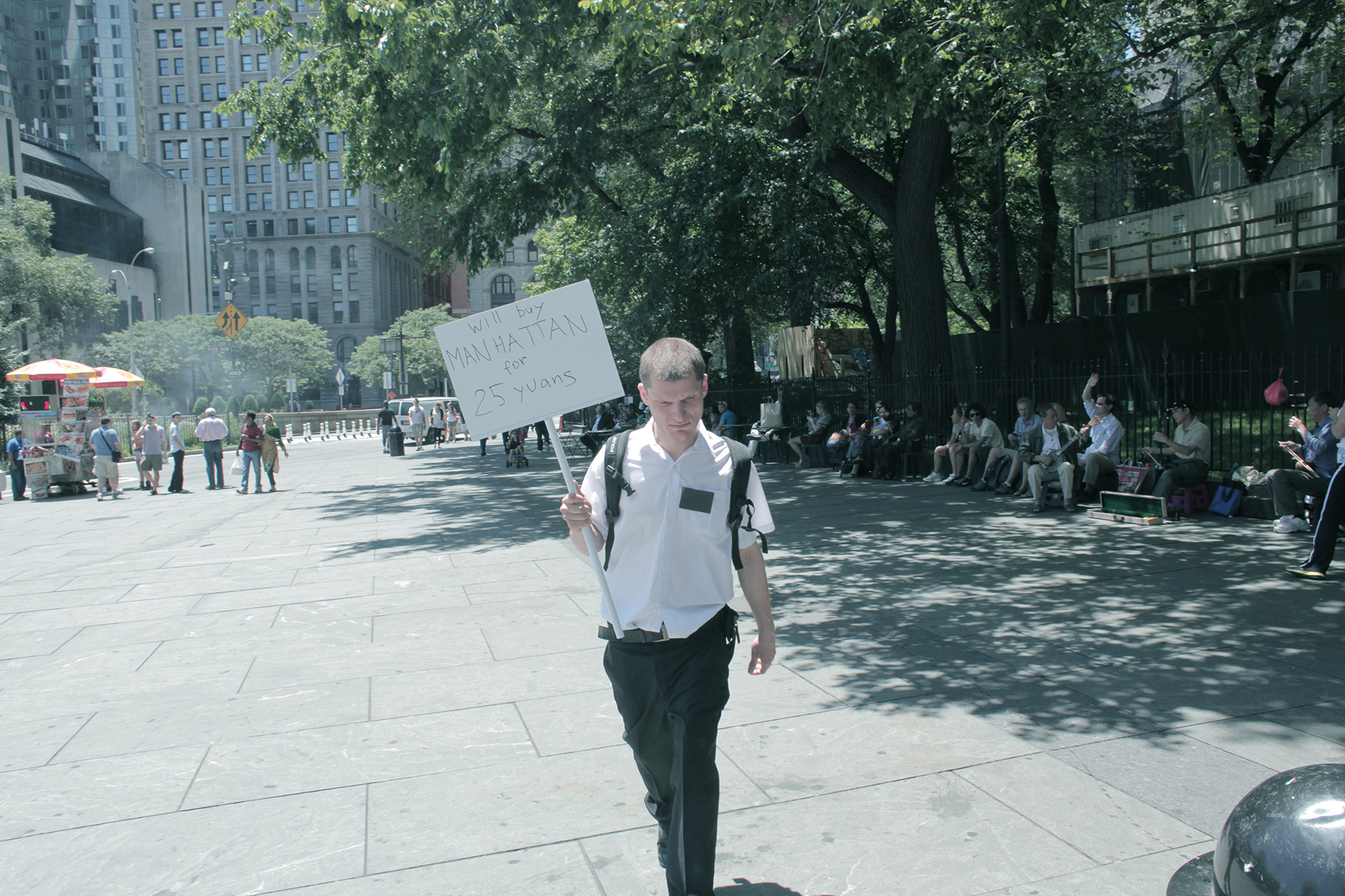 Спочатку я хотів висловитися з приводу присутності Китаю на геополітичній мапі світу. Однак, у процесі реалізації проект трансформувався у зовсім іншу історію. Його фабула пов’язана з історією Мангетену, який був куплений європейцями у індіанців за пригорщу намиста, що коштувало 24 долари. Отже, я приїхав до Нью-Йорку з комерційною пропозицією – купити цей велетенський острів за 25 грошових одиниць, цього разу не американських, а китайських – 25 юаней. Я зробив постер із слоганом “Куплю Мангетен за 25 юаней” та ходив з ним переповненими вулицями Мангетену.