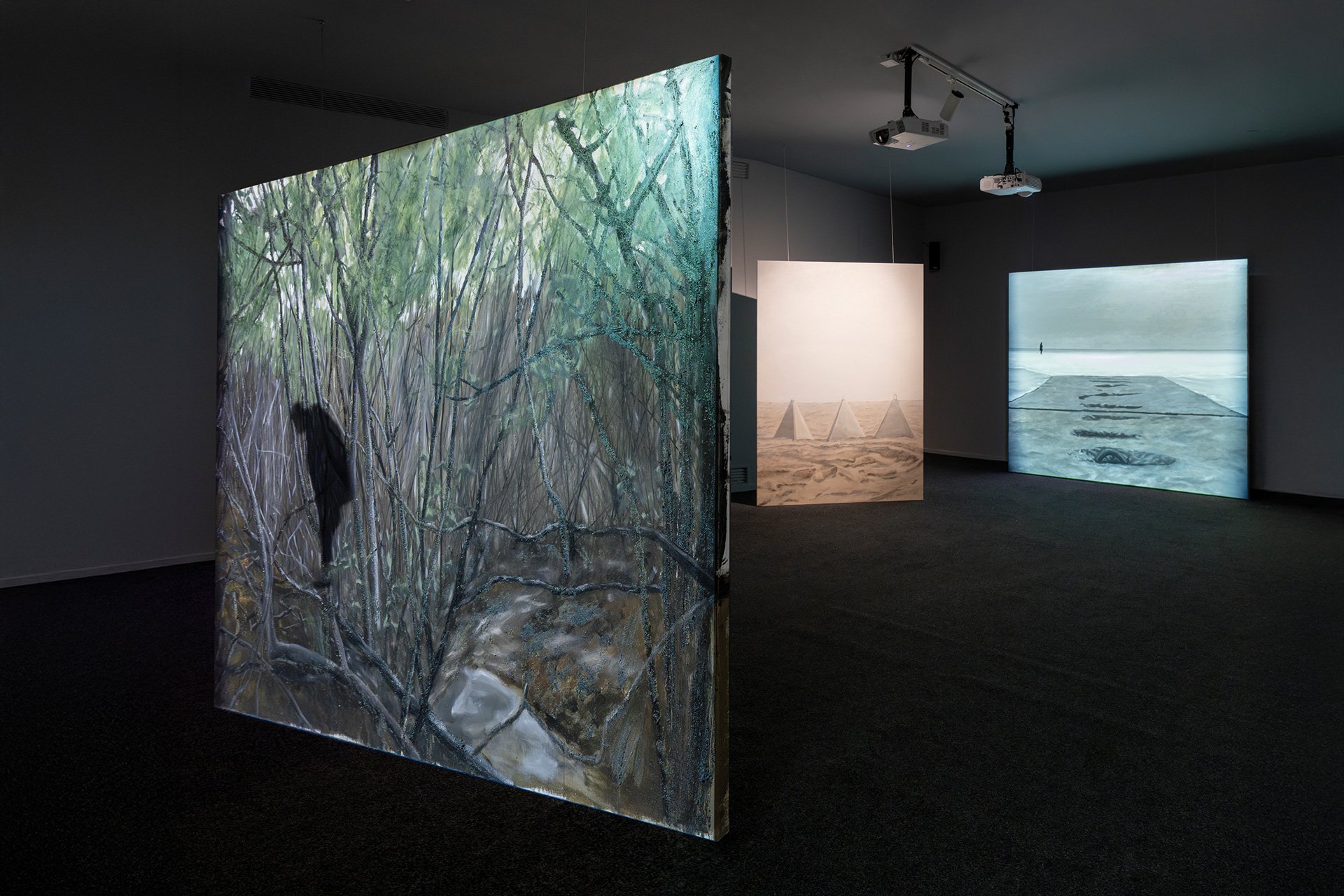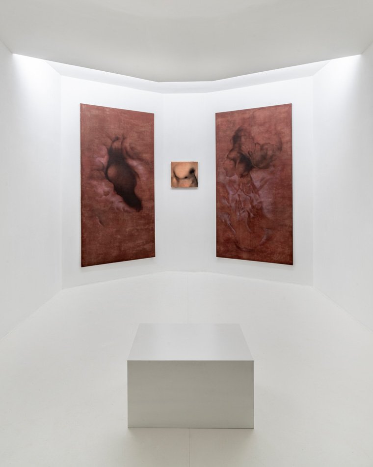 Бокові частини триптиху втілюють відбитки історії, що схожі на тіні, духів, клуби диму чи врешті рани. Ефемерні образи вислизають від однозначного трактування і тому вхоплюють складний вплив травматичного минулого та війни на пам’ять і свідомість. Прикметно, що через напівабстрактні зображення і крихкість тканинних полотен ці шрами ніби стають минущими, а насилля зникає. Близька до сакральної чуттєвість роботи й простору розкриває духовність, що віднаходить у вразливості людського тіла та душі образ божественного, позачасовий трепет.