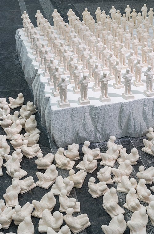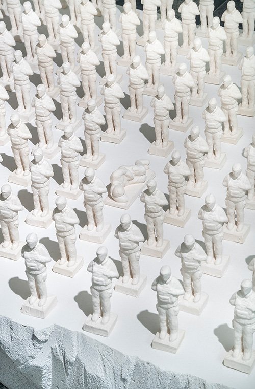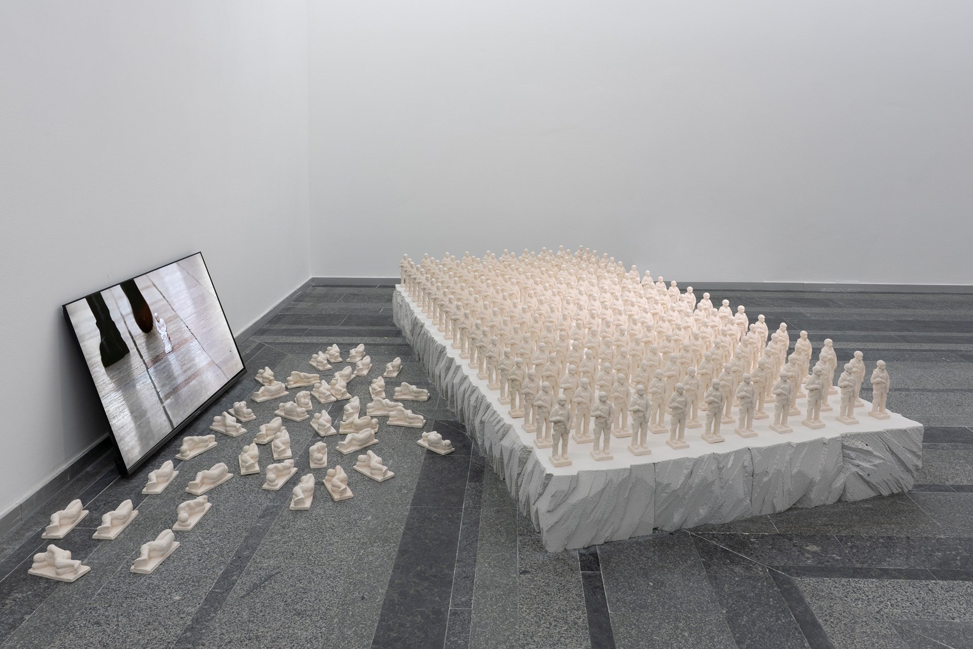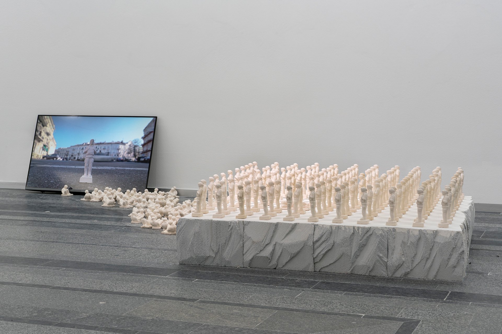 У групах фігурки ніби захищені своєю кількістю й згуртованістю. Втім, кожна з них залишається крихкою, особливо коли вони опиняються наодинці. Відео, представлені у просторі разом зі скульптурами, підкреслюють цей контраст. На них поодинокі «солдати» у громадських просторах стали своєрідними монументами, відкритими до взаємодії з пересічними людьми. Таким чином, досліджуючи потенційні шляхи меморіалізації, Дмитрик зосереджується на незахищеності та вразливості військових. Він підкреслює цей стан не лише на полі бою, а й у цивільному житті, зокрема серед звичайних громадян.