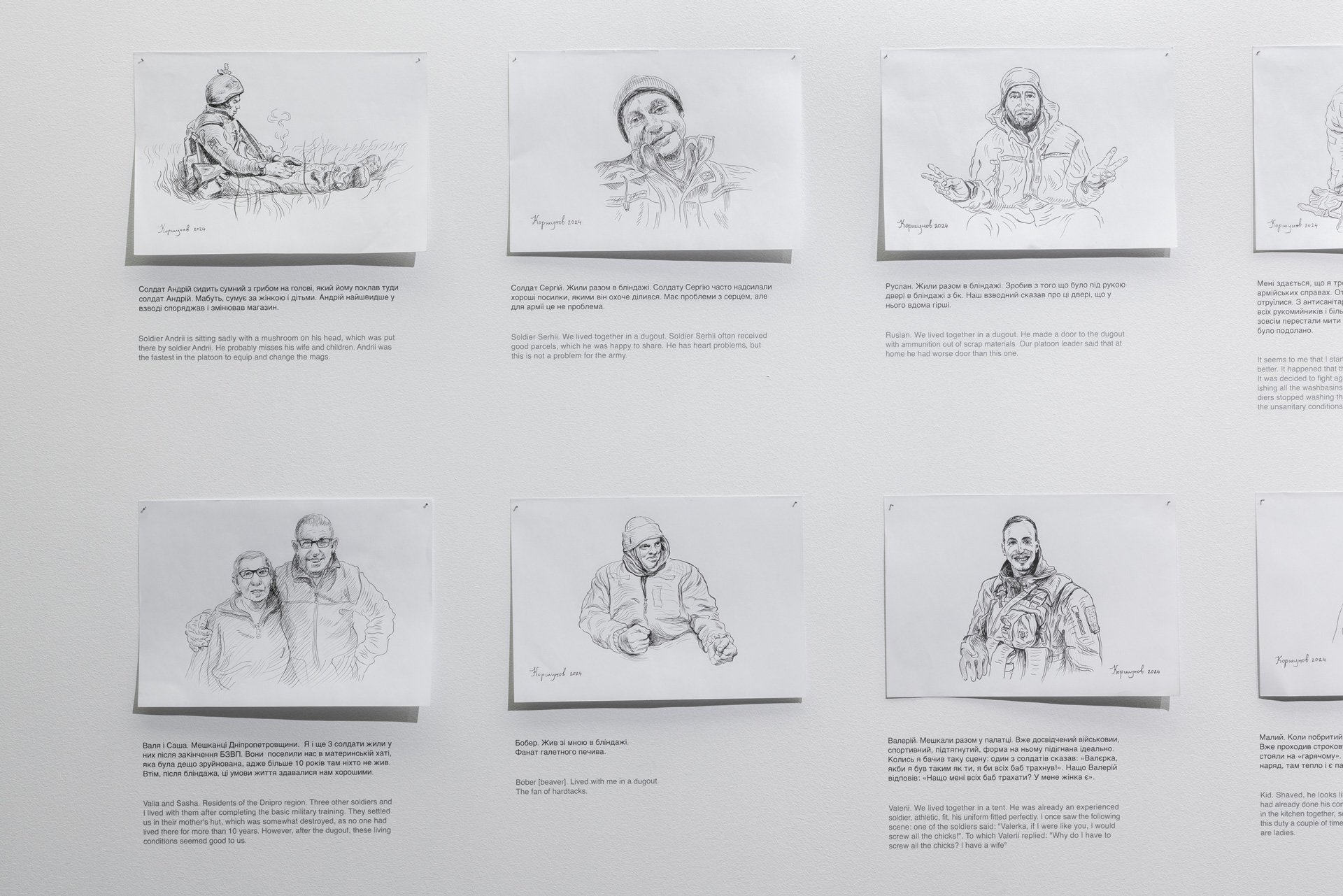 Власне, люди з найрізноманітнішими професіями й минулим, які перетнулися в армії, стають центром представленої роботи. Увага до них допомагає краще побачити обличчя, які стоять за узагальненим образом військового. Таким чином, робота підводить до роздумів про роль художника на фронті, ставлячи питання про те, чи є місце мистецтву в воєнній реальності.