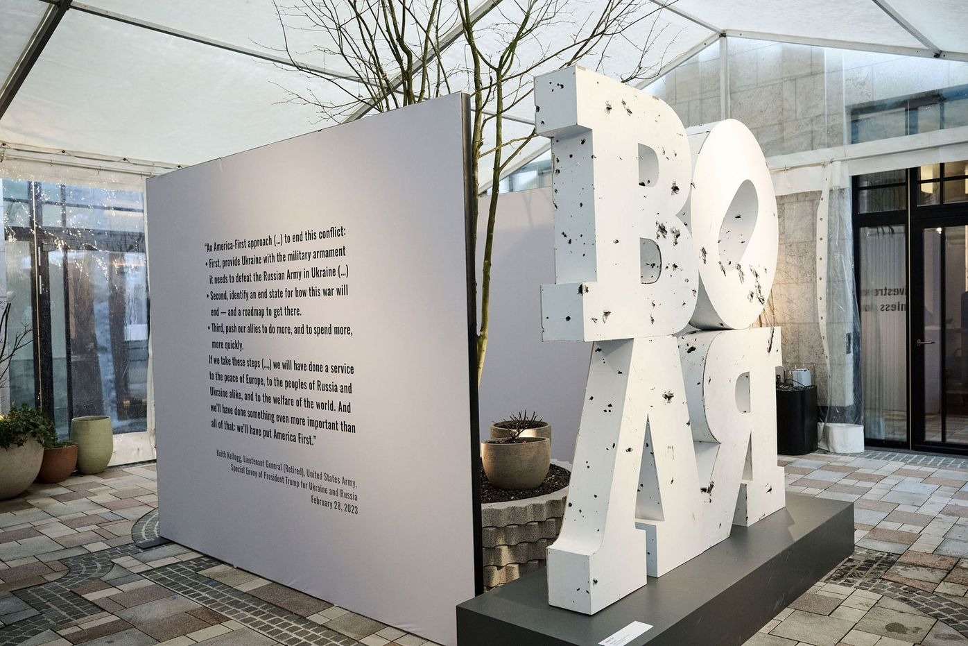 Цитати політичних лідерів та інших експертів, розміщені в експозиційному просторі, наголошують на геополітичних і глобальних наслідках війни в Україні. Майбутнє Європи, Заходу та світу під загрозою. Чи зможе світ знайти в собі рішучість зробити те, що потрібно?