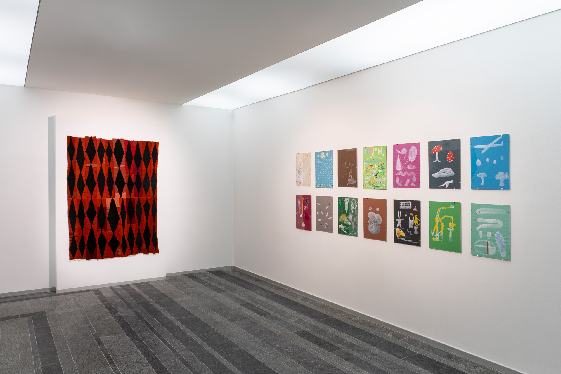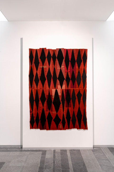 Робота «40 ромбів», створена Ксенією Білик на початку повномасштабного вторгнення, відсилає до напруження й невизначеності перших його місяців. Візуальною основою гобелена є ромб — дохристиянський символ землі, який художниця поєднує з чорним і червоним кольорами, підкреслюючи трагічність її долі під час воєнних дій. Назва роботи також відсилає до біблійних конотацій числа 40, що символізує і блукання людської душі, і 40-денний піст, відображаючи духовний шлях, сповнений випробувань, витривалості та, зрештою, очищення.