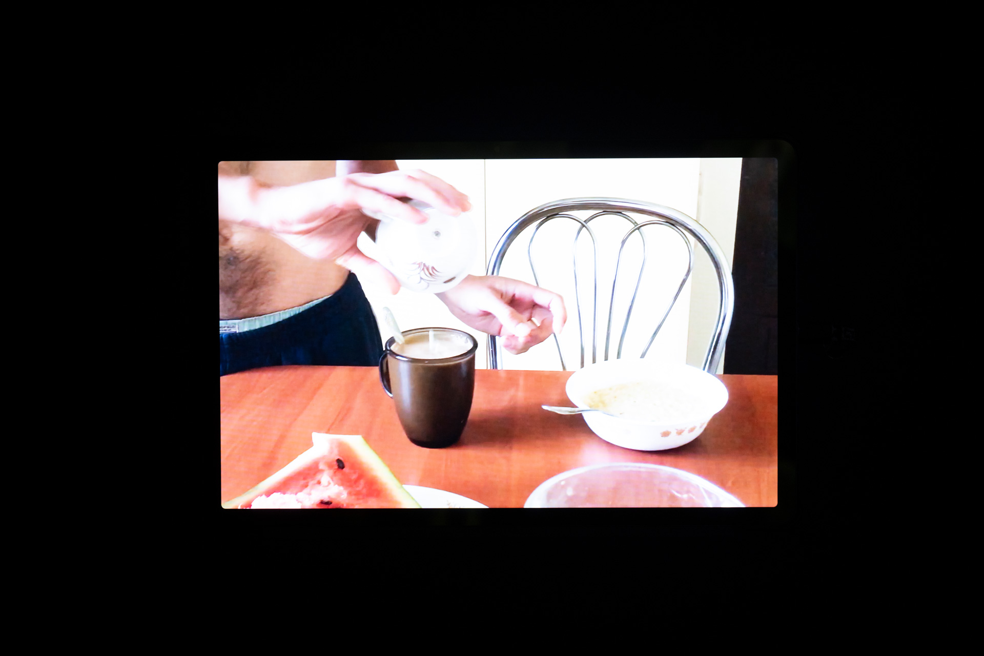 Приготування ранкової кави для Тараса завжди супроводжується особливим ритуалом — перед тим як додати молоко, він наливає його в окреме маленьке горнятко, а вже потім додає до чашки кави. Він переконаний, що такі маніпуляції дозволяють молоку довше залишатися свіжим. У відео «В саду Тараса» художниця Катя Лесів документує цю щоденну звичку, де повторювана з дня у день дія перетворюється на жест турботи про себе. Хоча жодних наукових доказів чи власних спостережень, які підтверджували б ефективність цього способу, немає, він стає своєрідною опорою — маленьким звичаєм, що підтримує ритм повсякденності й утверджує її стабільність. У періоди невизначеності такі несуттєві, але віднайдені кожною людиною акти піклування набувають рис магічного ритуалу, де важливим є не результат, а сама повторювана послідовність рухів.