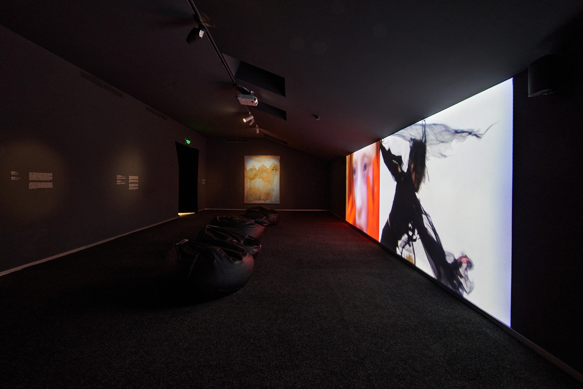 Пара чорних очей спрямована в темряву виставкової зали — ця присутність погляду іншого пронизує, створює тривожне відчуття постійного спостереження. Живописне полотно «Очі» стало останньою роботою художника Олега Голосія, яку він створив незадовго до своєї трагічної загибелі. Воно так і не було завершене — майже схематичне зображення обличчя, що виринає з розводів і підтьоків фарби, надає йому особливої динаміки, та водночас викликає відчуття невловимості — образ поступово розчиняється і зливається з тлом. Звертаючись до екзистенційних страхів і тривог, художник наче відкриває простір потойбічного — погляд, що постає з безодні, несе відчуття невідворотної зустрічі з чимось більшим і непізнаним.