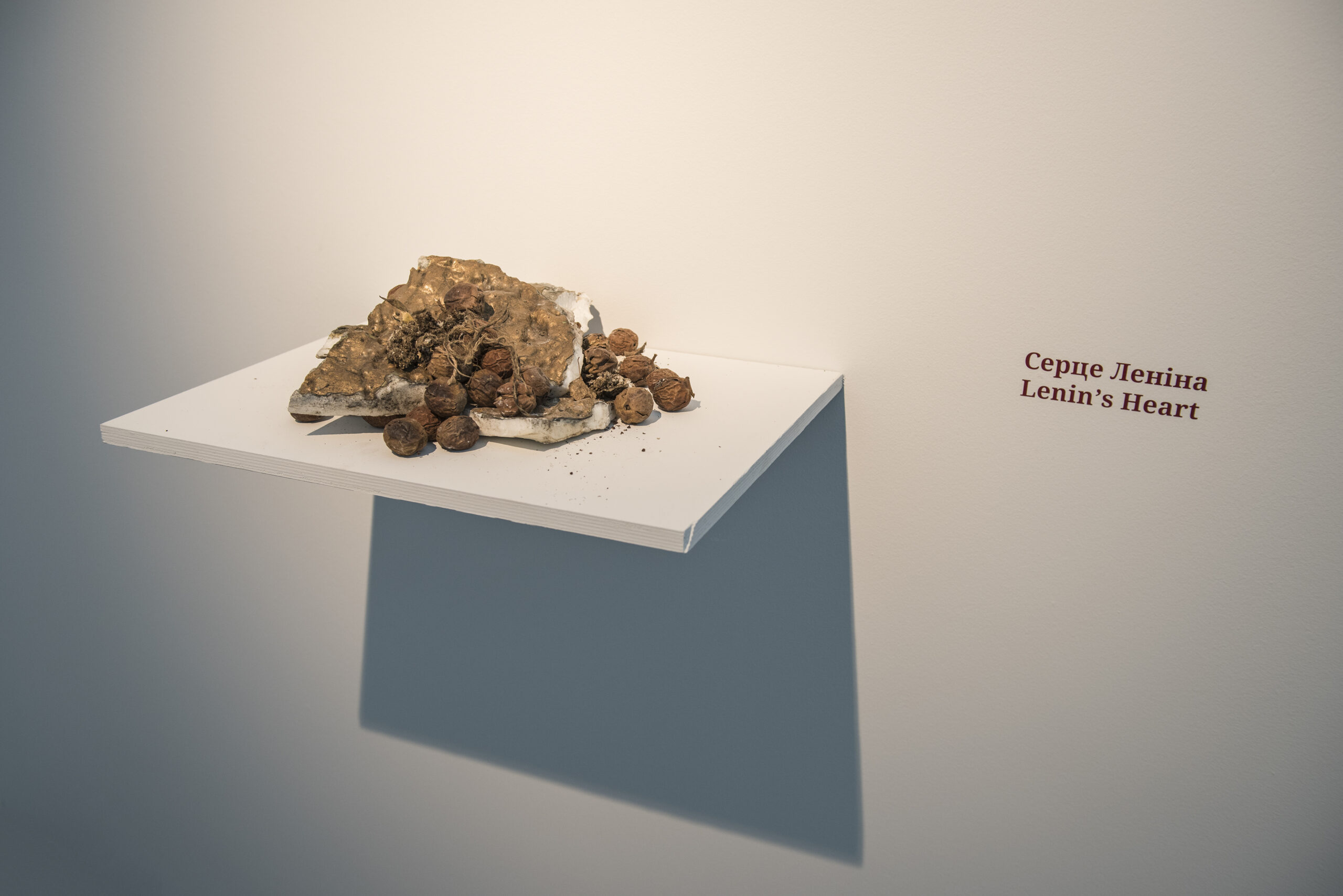уламки зруйнованих пам'ятників, кольорова фотографія, репринти радянських журналів, збірка цитат.