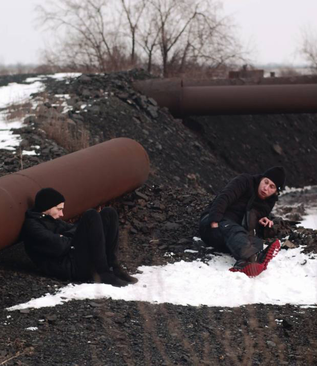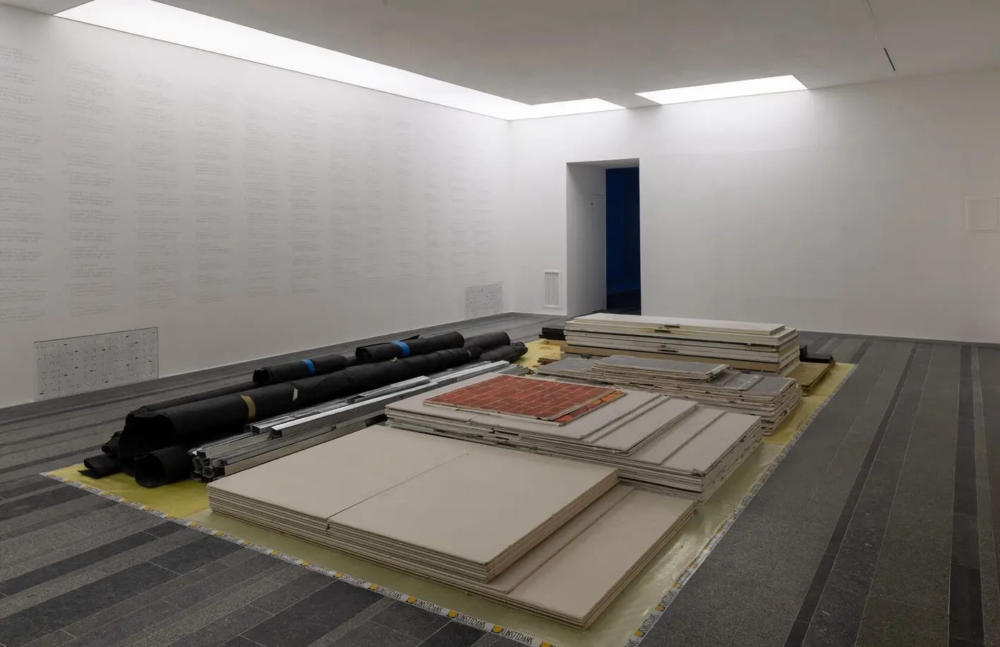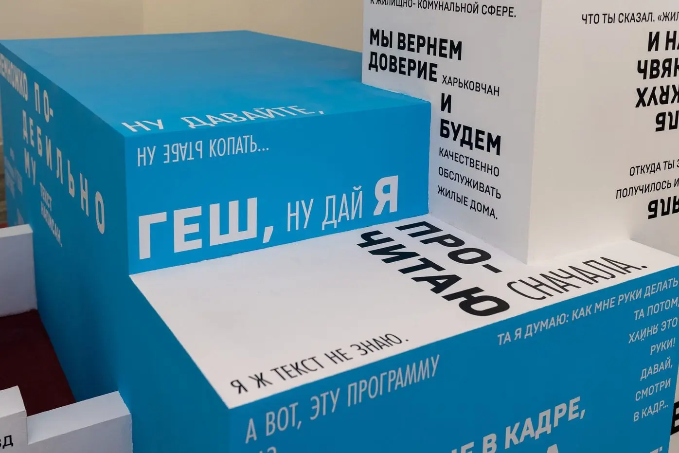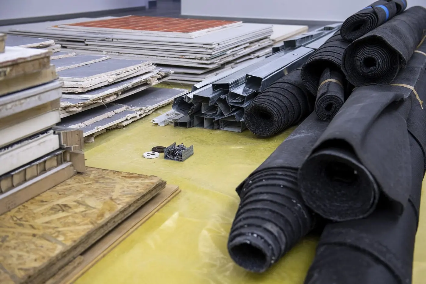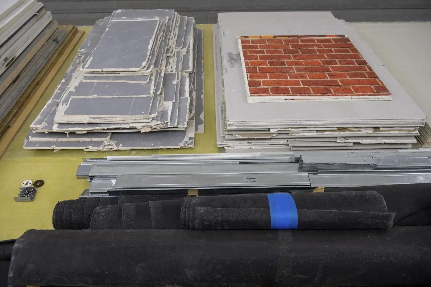 Гіпсокартон, профіль, кабель-канал, ковролін, плівка, брус, пресована деревина. Ініційовано художником та художницею.