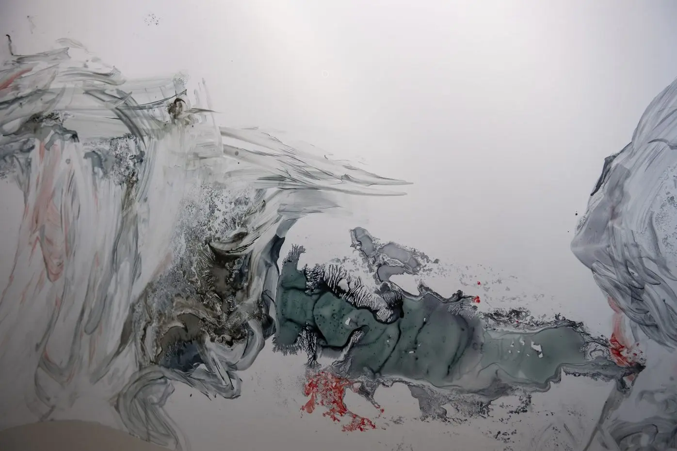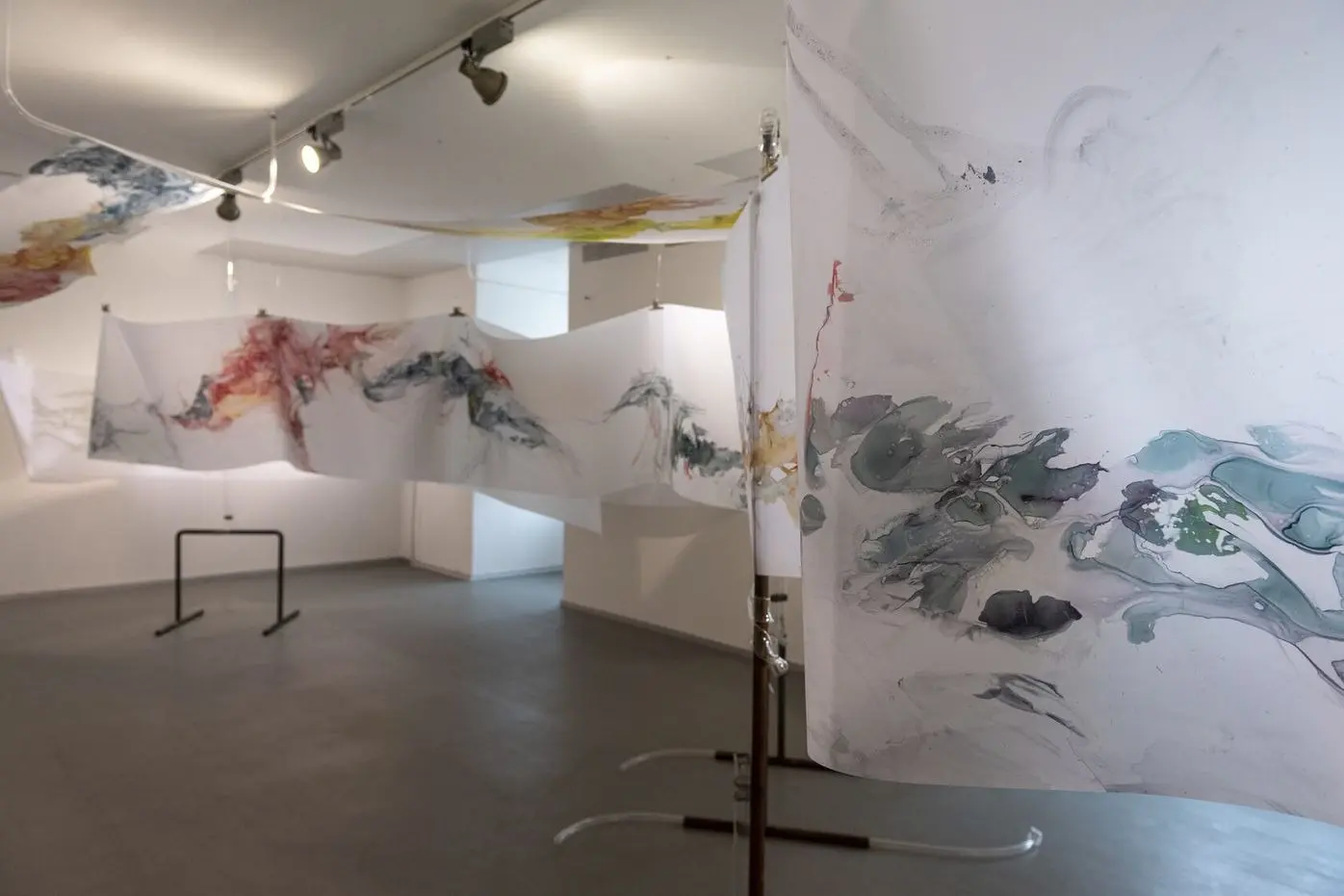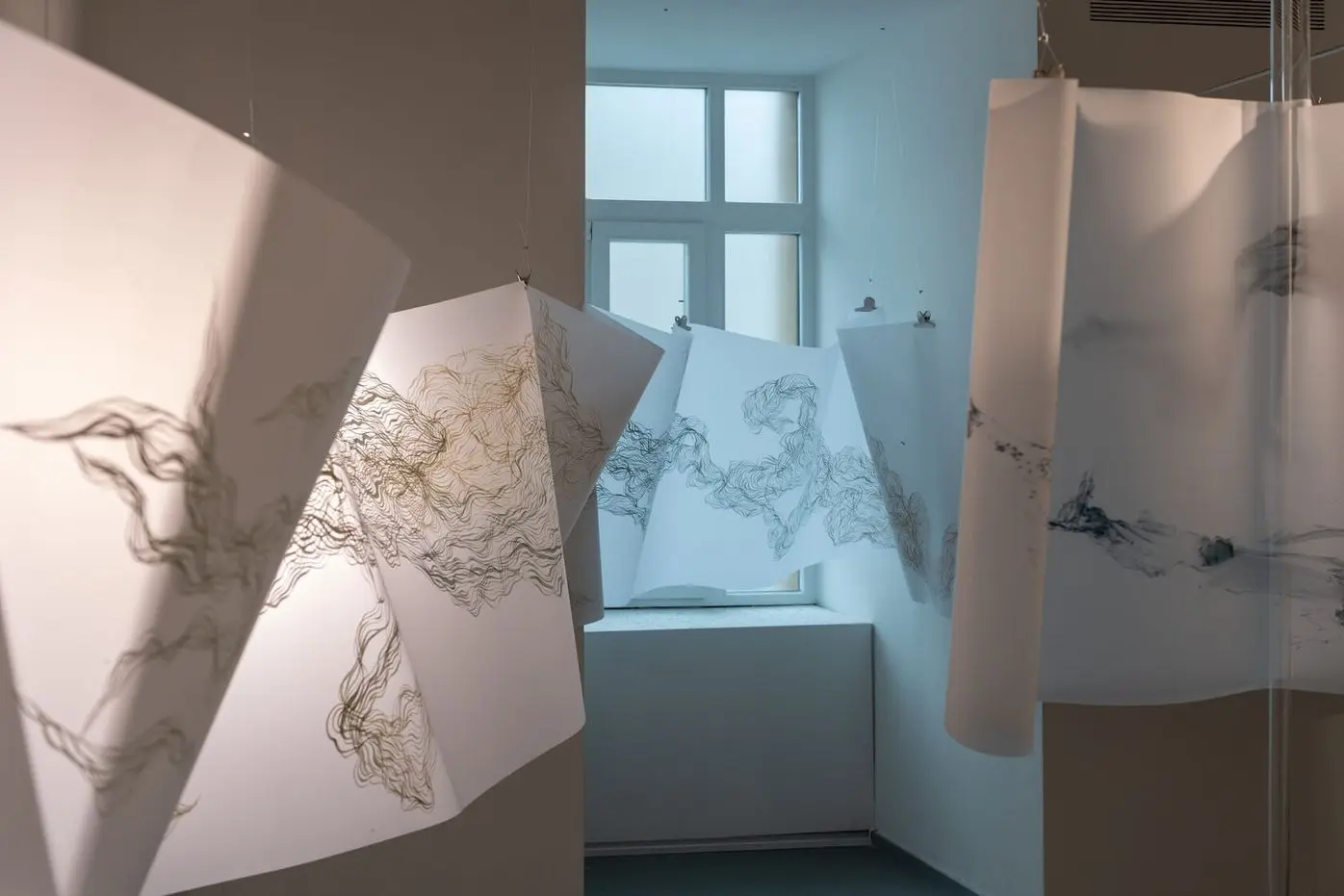Туш на 20-метрових рулонах плівки, акрилові та металеві труби. Надано художницею. Асистент з монтажу – Віталій Кохан.